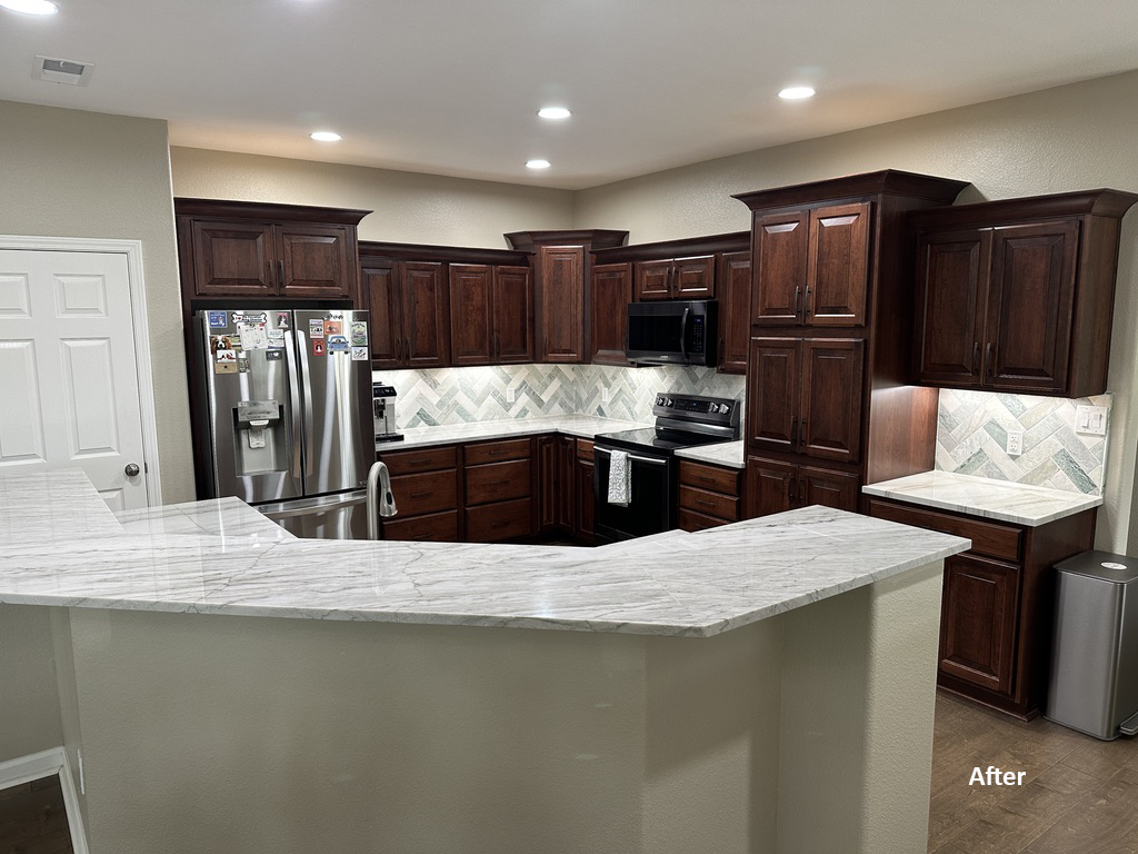 For this kitchen remodeling project, we updated the cabinetry with beautiful cherry doors in a rich cinnamon stain from our Kitchen Solvers Legacy Collection. The new cabinetry brings warmth and character to the space. The transformation continued with a fresh backsplash, adding a modern touch and a pop of texture. To complete the look and enhance functionality, we installed new undercabinet lighting, creating a brighter, more inviting workspace.