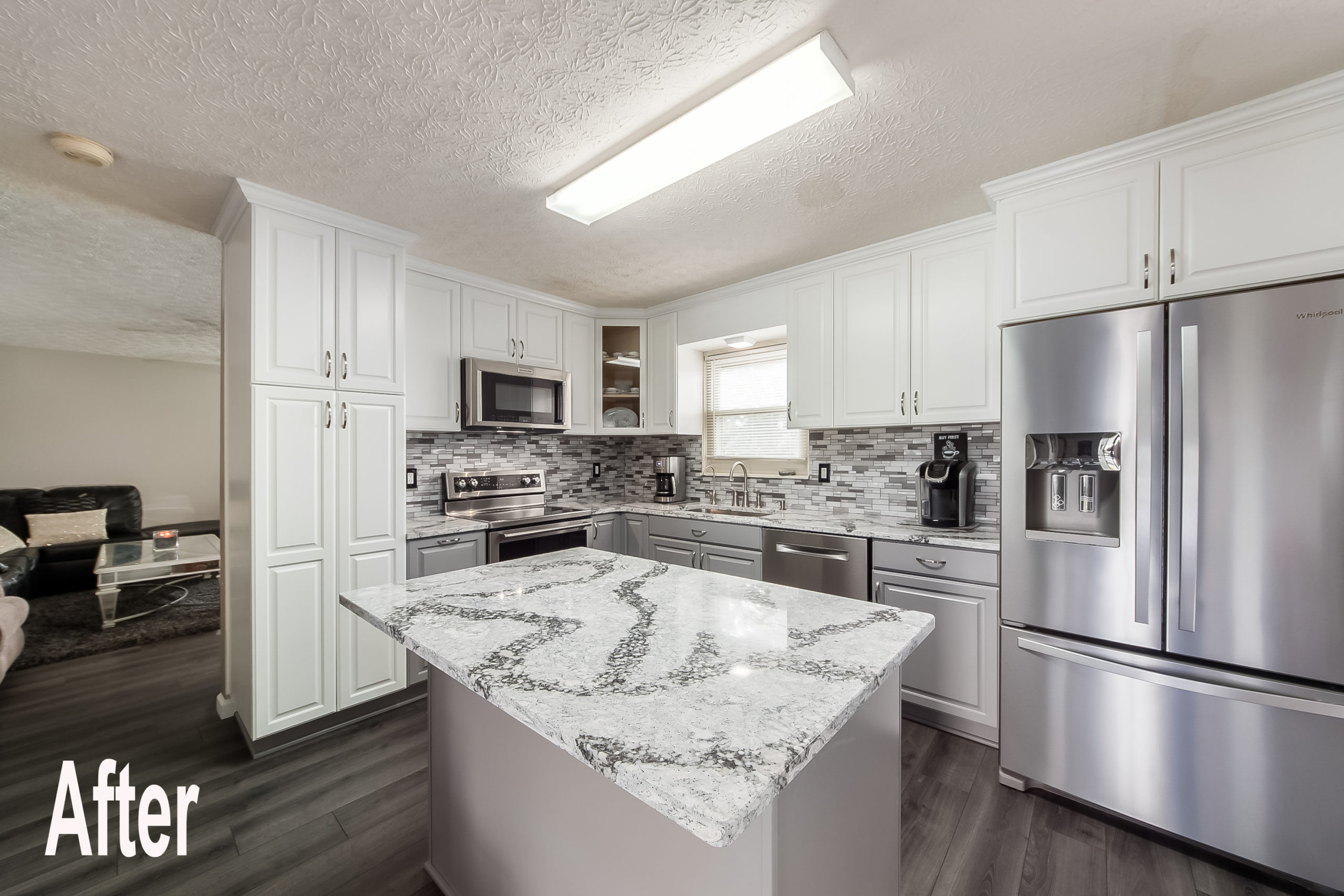 To give the kitchen a duo-tone look, but not be overly contrasting, we installed lower cabinets in a pewter color and upper cabinets in a snow color. The Cambria Seagrove backsplash and quartz countertop perfectly coordinates with the cabinet colors to give the whole kitchen a finished look. The homeowners set out to accomplish a more modern look, more storage space, more functionality, and a space they were excited to walk into every day. Their expressions told us we accomplished that and so much more!