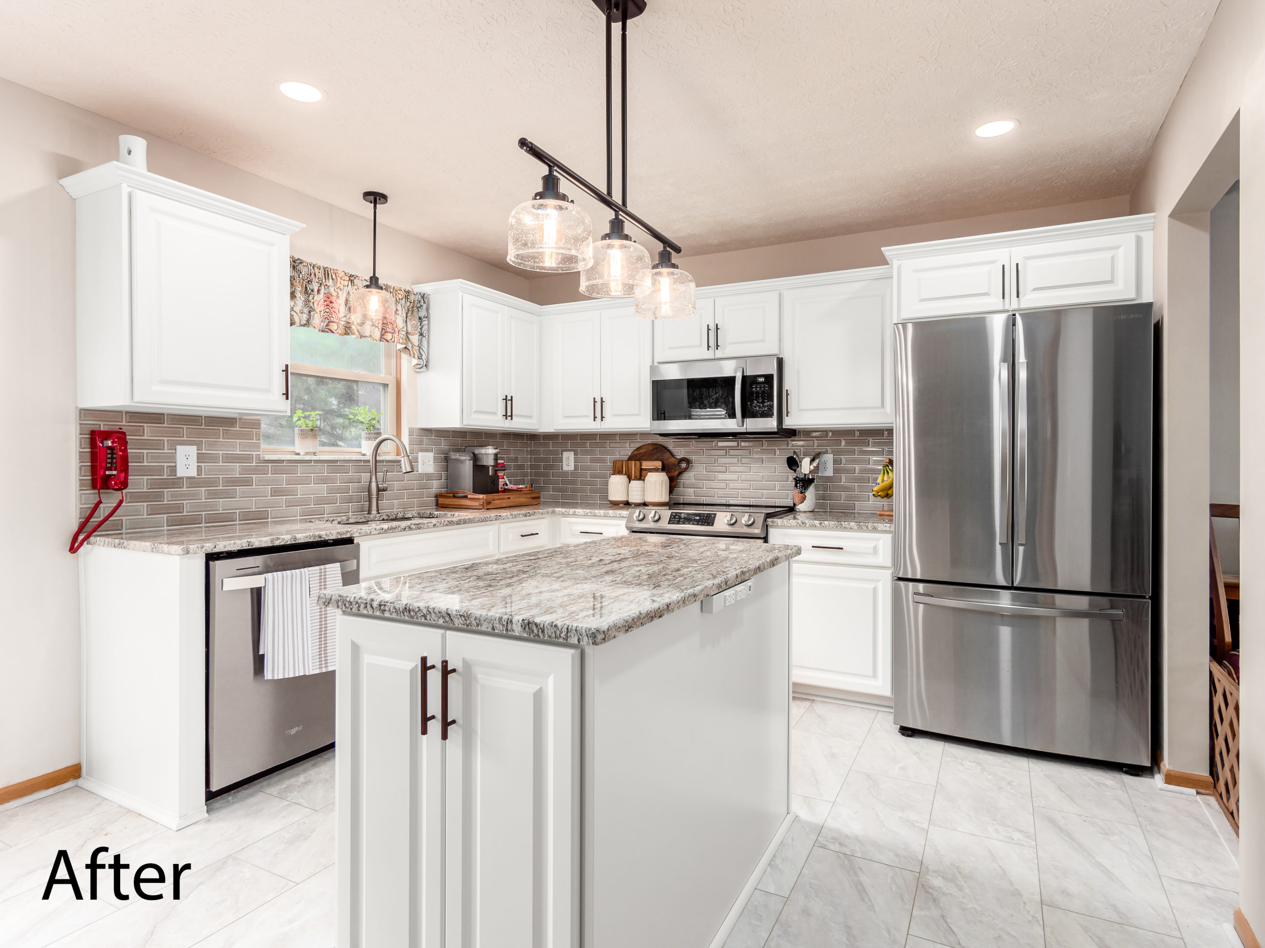 The final touches don’t go unnoticed in this kitchen. Updating the lighting from a dated ceiling box light to overhead can lighting and a couple of statement light fixtures over the island and sink make all the difference. New luxury vinyl tile flooring replaced the dated ceramic tile and finally, an updated microwave and oven to match the other stainless steel appliances tie the whole room together. Most homeowners are moving away from the hardwired home telephone, but this homeowner leaned in and installed a bright red phone on the wall and let it become a focal point of their new kitchen. Thanks to Kitchen Solvers of Columbus, this customer’s wildest kitchen dreams became a reality.