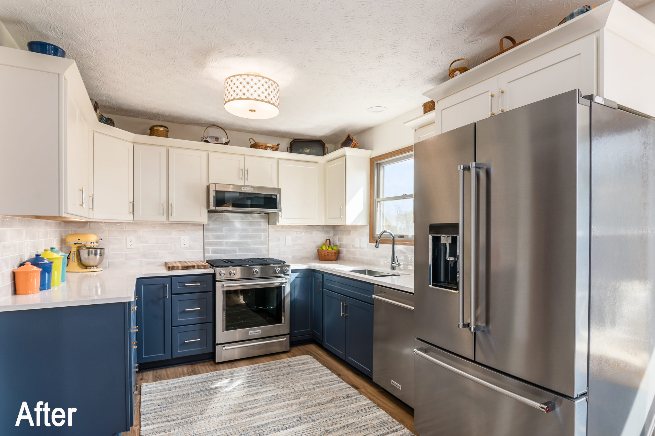 When Columbus, Ohio homeowners contacted us about their outdated kitchen, we found out very quickly we could do a hybrid kitchen remodel. With some of the cabinetry still in functional condition and in the right layout, but the rest of it needing to be replaced or added to, we were able to use a combination of cabinet refacing and new cabinetry to install the perfect space for these homeowners. All of the existing cabinets were refaced. The midnight blue base cabinets coupled with the alabaster white upper cabinets really gave this kitchen an elegant look. We also incorporated bench seating for more functional storage and seating. Having the seating flow into the wall and removing the existing island opened up the space considerably.