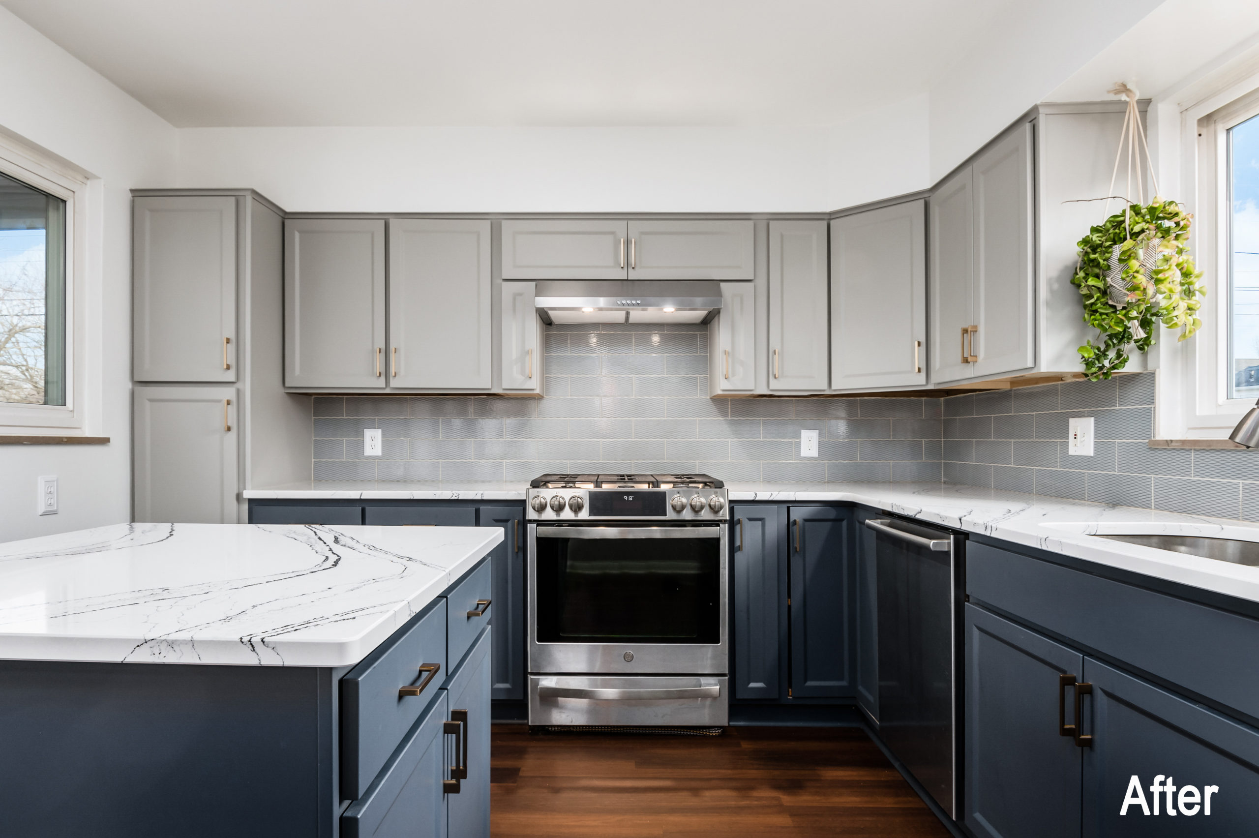 The combination of the Haze and Midnight colors with the countertops and the backsplash give this space a completely new more modern look. To really complete the new stunning space, a wall that was separating the kitchen from the dining room was replaced with a half-wall, which not only opened up the space, but allowed for extra lighting. This duo-toned, very functional, and modern kitchen is now ready for cooking, entertaining, and just enjoying!