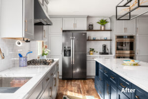 To achieve this new layout, we tore out the existing peninsula and the cabinets above the peninsula along with the soffits to open up the kitchen. Next, we removed the wall that currently housed the oven and extended the kitchen into the next room. We then got busy installing all new cabinets. They went with our Portland door in maple from our Kitchen Solvers Classic Collection line. For the island they went with a Gale Force color, while the rest of the kitchen cabinets were done in a willow color. Next, we installed a new Cambria quartz countertop in Portrush, a white beveled subway tile backsplash and wood floating shelves. Now this is truly a stunning kitchen transformation.