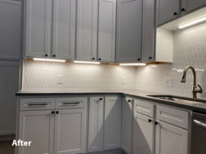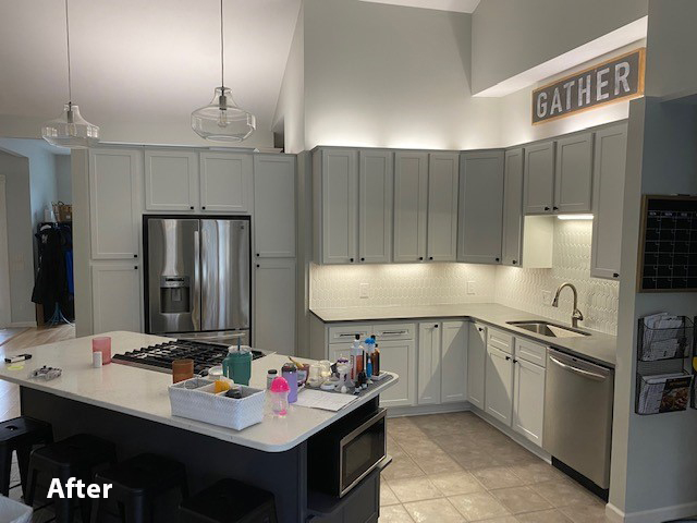 For this kitchen remodel, the homeowner was looking to do away with the two-tier island as it didn’t give them much room around their cooktop. We tore off the old countertop and made the island one level for them which gave them more room to work. For the kitchen cabinets, since they were in good condition, cabinet refacing was the perfect solution for them. They went with the Stratus white cabinets for the perimeter cabinets, while the island was done in a flint color. We also added a picket gloss white ceramic tile backsplash and soffit crown molding. For the island countertop they went with a quartz countertop in Soho while the perimeter countertop was done in a Storm color. Now this homeowner has the kitchen of their dreams.