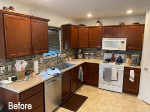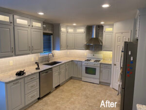 We then removed the microwave and installed a stainless-steel hood in its place. For the hutch area, we added all new cabinets with some glass doors in the upper cabinets and a microwave cabinet in the lower cabinet with some additional storage. We were able to add this new cabinetry, but match it with the existing cabinets and then reface all cabinets to give them the same look. For the hutch portion of the kitchen, the cabinets were done in a pewter color to add a little more detail. Next, we installed new under cabinet lights and ran lighting inside the glass doored cabinets to really brighten up the space. To finish the new look, we installed a ceramic tile backsplash in a light gray. This kitchen is now transitional, bright, and more functional. It is full of storage and the homeowners are excited to call it their own!