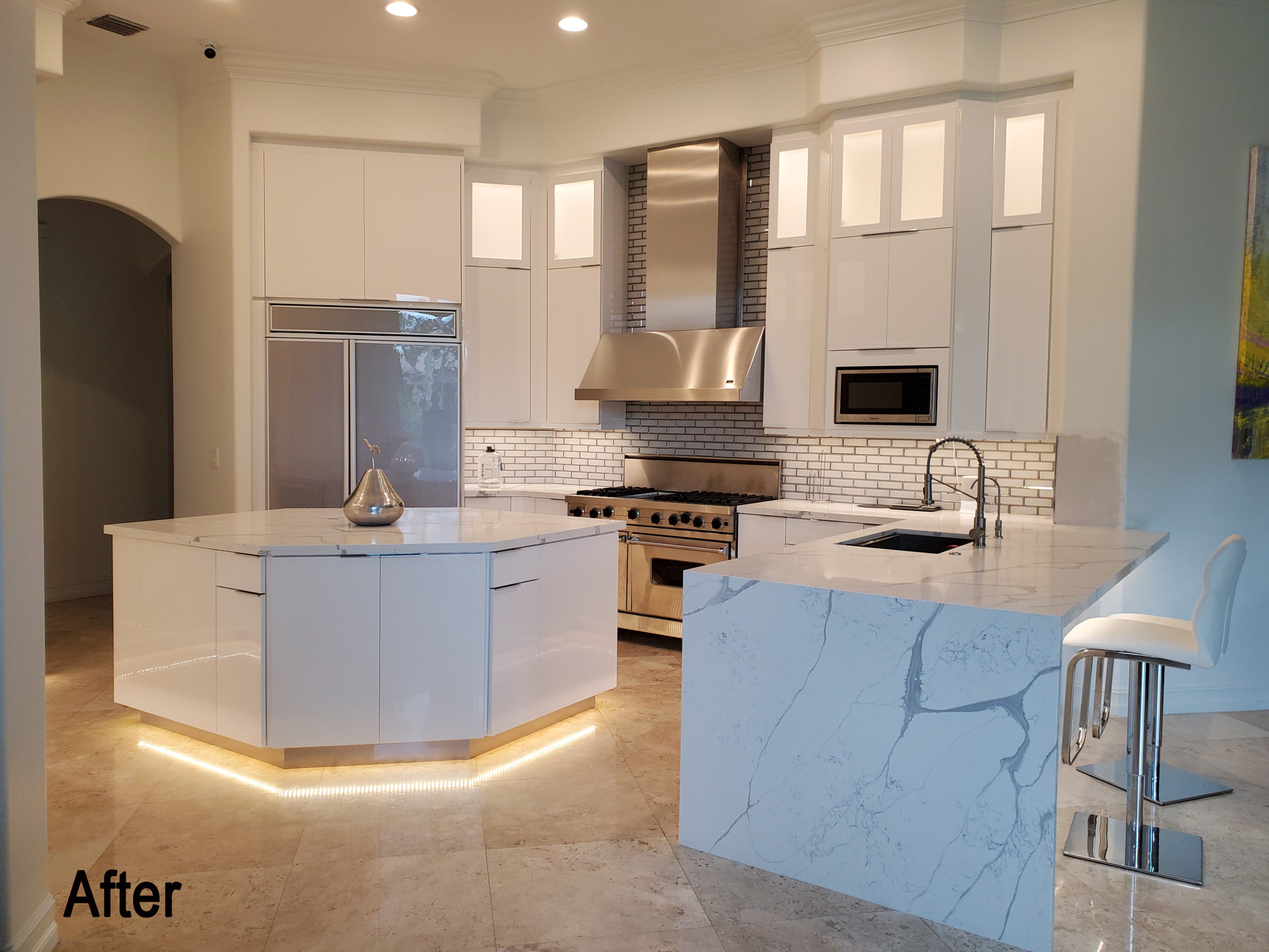 A new Quartz countertop in Unique Calacatta and a backsplash done in a glazed tile that has a mirrored effect on the edges gave the kitchen that stark, bright, white, modern look. To finish this new look, we installed LED lights inside the tall cabinets, under the cabinets on the countertop, and the toe kick in the base cabinets. Now every time our client walks into their kitchen, it is bright, cheerful, clean, and ready to use! Fully stocked with storage options, functionality, and a stylish new design is exactly what we had in mind when we first stepped into this kitchen and we appreciate the opportunity to make it a reality.