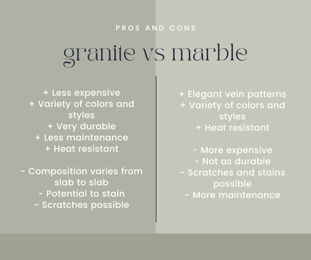 While neither marble or granite are a cheap countertop option, the beauty and durability of the stones make them well worth the cost. Granite is typically the less expensive of the two starting at roughly $75/square foot. Marble countertops can start at around $100/square foot. Prices always fluctuate of course so check with your local supplier for up-to-date pricing.