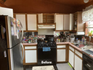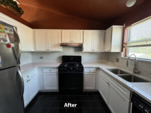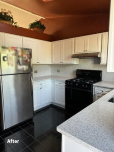 We got to work refacing their cabinets with Stratus White shaker style doors. We also replaced their old drawers with new solid wood dovetailed constructed drawers and added 2 rollouts under the sink. If you’re thinking about what to do with your kitchen space, contact us today for a free consultation.