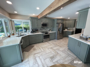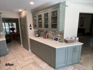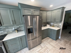 done in a stunning Thyme color. Next, we also added crown molding to the tops of the cabinets while also adding pullout drawers to their pantry. To finish this stunning transformation, we installed a new Calacatta Oro quartz countertop. Just look at how amazing this kitchen looks now!