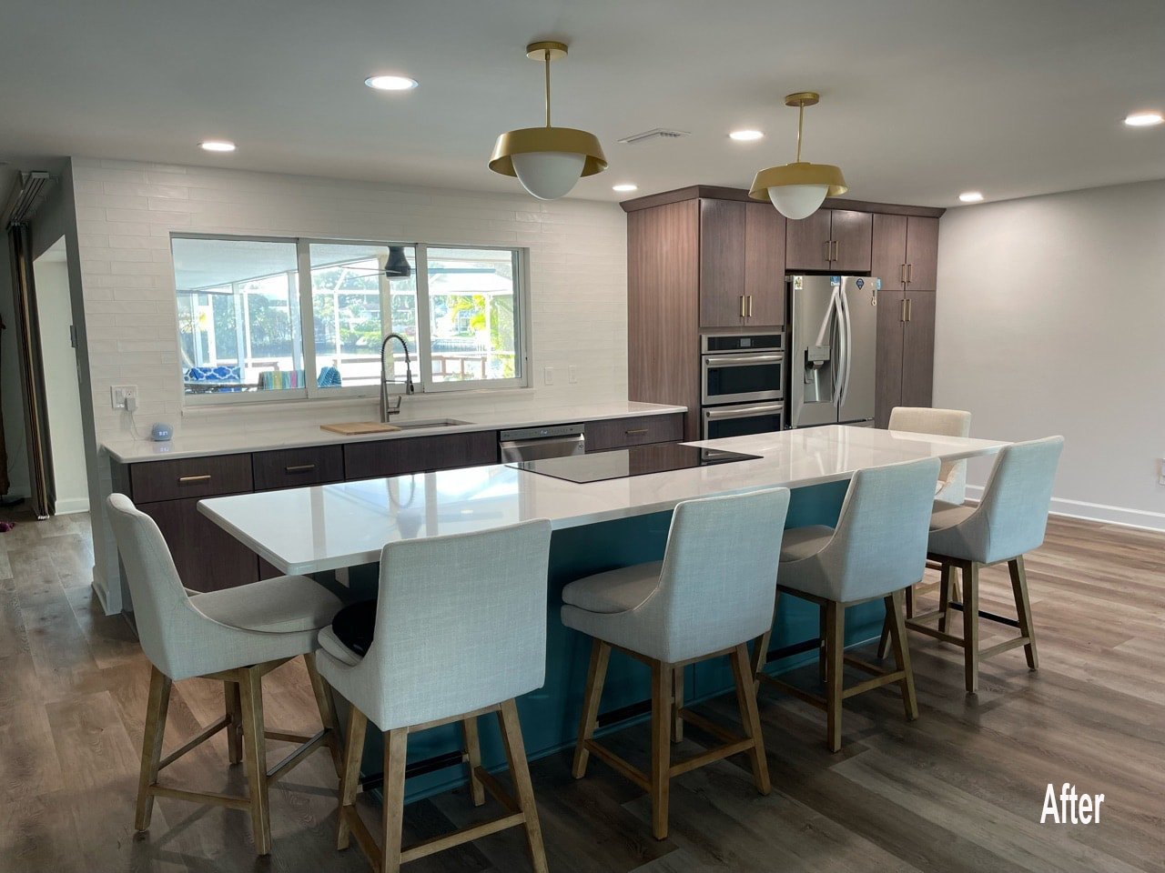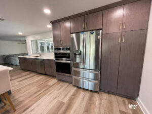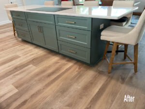 To really make this kitchen stand out, we did the cabinets in a Walnut warm grey color, while the island and dry bar were done in a Rocky River color. To finish this stunning new look, we installed a new Calcutta gold quartz countertop, white subway tile backsplash, vinyl plank flooring and crown molding. Now this is a show stopping kitchen!