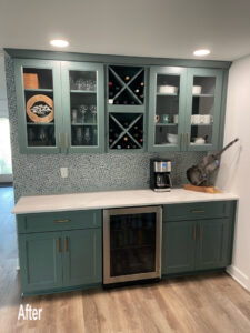 For this kitchen remodeling project, the homeowners were looking to open up their kitchen to give them more room. To achieve the look they were hoping for, we removed a few walls to open the space up. This also allowed us to add the new island and dry bar that they were dreaming of having. For the new cabinets that we installed, they went with slab for the kitchen cabinets, while the island was done in a shaker door.