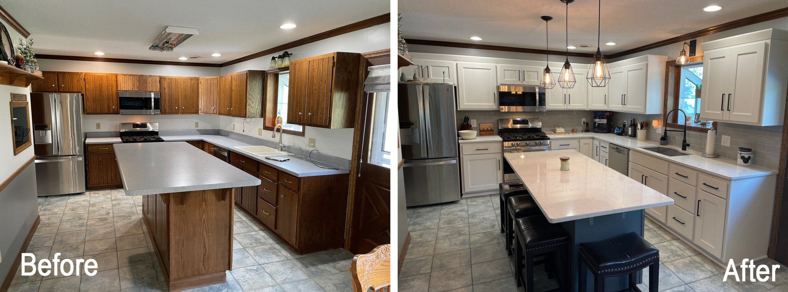 Cabinet refacing allows you to have the look you’ve always dreamed of without the additional expenses and time commitment of a full kitchen renovation. Refacing is a quick and painless way to give a fresh new look to your cabinetry without a complete cabinet remodel. Here at Kitchen Solvers cabinet refacing is one of our specialties. We simply replace all the existing doors and drawer fronts with a door style, wood species, and finish of your choosing. We then apply a matching refacing material to all exposed end panels and face frames of your existing cabinets. If you’re looking to upgrade the aesthetic in your kitchen look no further, the cabinet refacing process is as painless as a kitchen update can get.