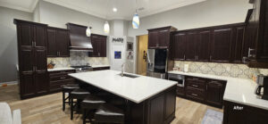The new kitchen design features beautiful perimeter cabinetry that extends around the corner into the dining area, where we created a dedicated appliance wall. A standout feature is the 48-inch-wide appliance garage cabinet, which we customized with floating shelves for both style and functionality. At the center of the space, we installed a large island designed to maximize the slab size and create the perfect gathering place.