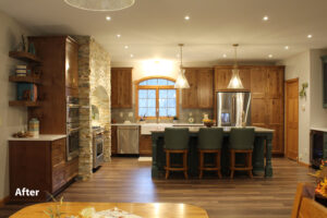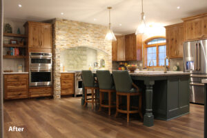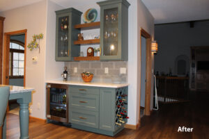 This kitchen remodeling project was a fun one. This kitchen was good sized but had a very awkward layout and flow. It was long and narrow but had great potential. The removal of two walls made room for a massive island with a prep sink and all the space needed for an efficient kitchen. The new cabinets were done in the Manhattan door from our Kitchen Solvers Classic Collection line. The island and dry bar were done in the Rocky River color while the perimeter cabinets were done in Cashew. For the new countertops, they went with the Torquay Cambria Quartz for the perimeter while the island was done in Berwyn. This two-toned look with a green island and dry bar along with the gorgeous split-faced range hood arch provided the pop needed to make this kitchen one for the books.