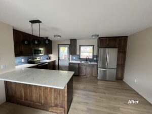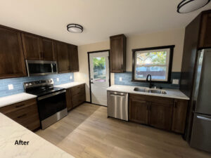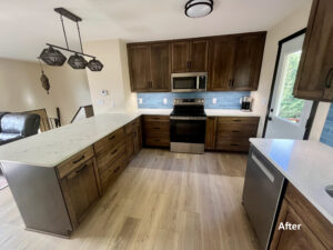 create a spacious peninsula. The new hickory cabinets feature a beautiful Mediterranean wiping stain, paired with stunning Calacatta Azulean quartz countertops and a 2” x 8” Matte Keepsake Blue backsplash for a pop of color and personality. A refreshed layout, warm wood tones, and striking details—this kitchen now has the perfect blend of functionality and style.