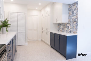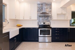 For the new cabinets, they went with our Portland door from our Kitchen Solvers Classic Collection line. The upper cabinets were done in white, while the lower cabinets in a naval color. We next installed an eye-catching Santa Monica Warm Deco backsplash for the hood area, while the rest of the kitchen was done in a Bianco glossy porcelain subway tile. To finish this new kitchen transformation, we installed a new iconic white quartz countertop. Now these homeowners have the kitchen of their dreams.