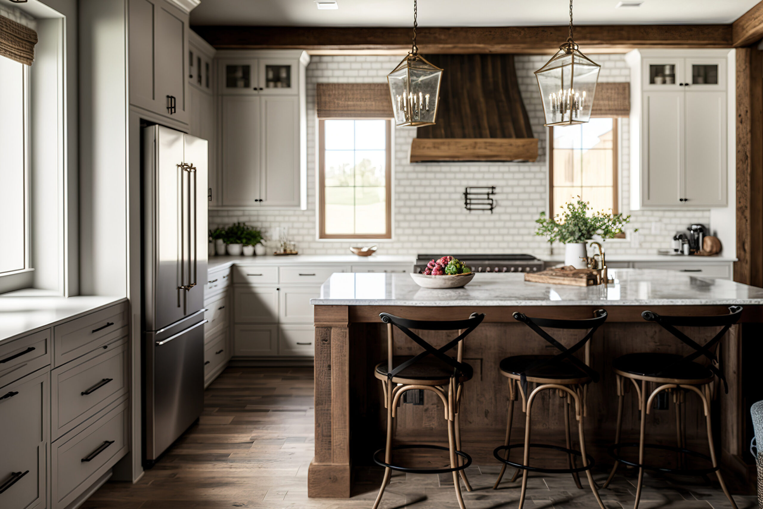 A modern kitchen can be defined by its sleek lines, minimal design, and cutting-edge technology. Imagine clean, uncluttered spaces that emphasize functionality and efficiency. In a modern kitchen, you’ll most likely find glossy cabinets, stainless steel appliances, and surfaces like quartz or concrete countertops. When it comes to color, the palette tends to be neutral with pops of bold color used sparingly. Lighting fixtures are usually sleek and understated to add to the overall sense of sophistication.
